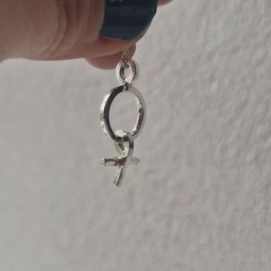 Handgjort silverhänge med kvinnosymbol. Symbolen har en rörlig del som dinglar när man rör sig.