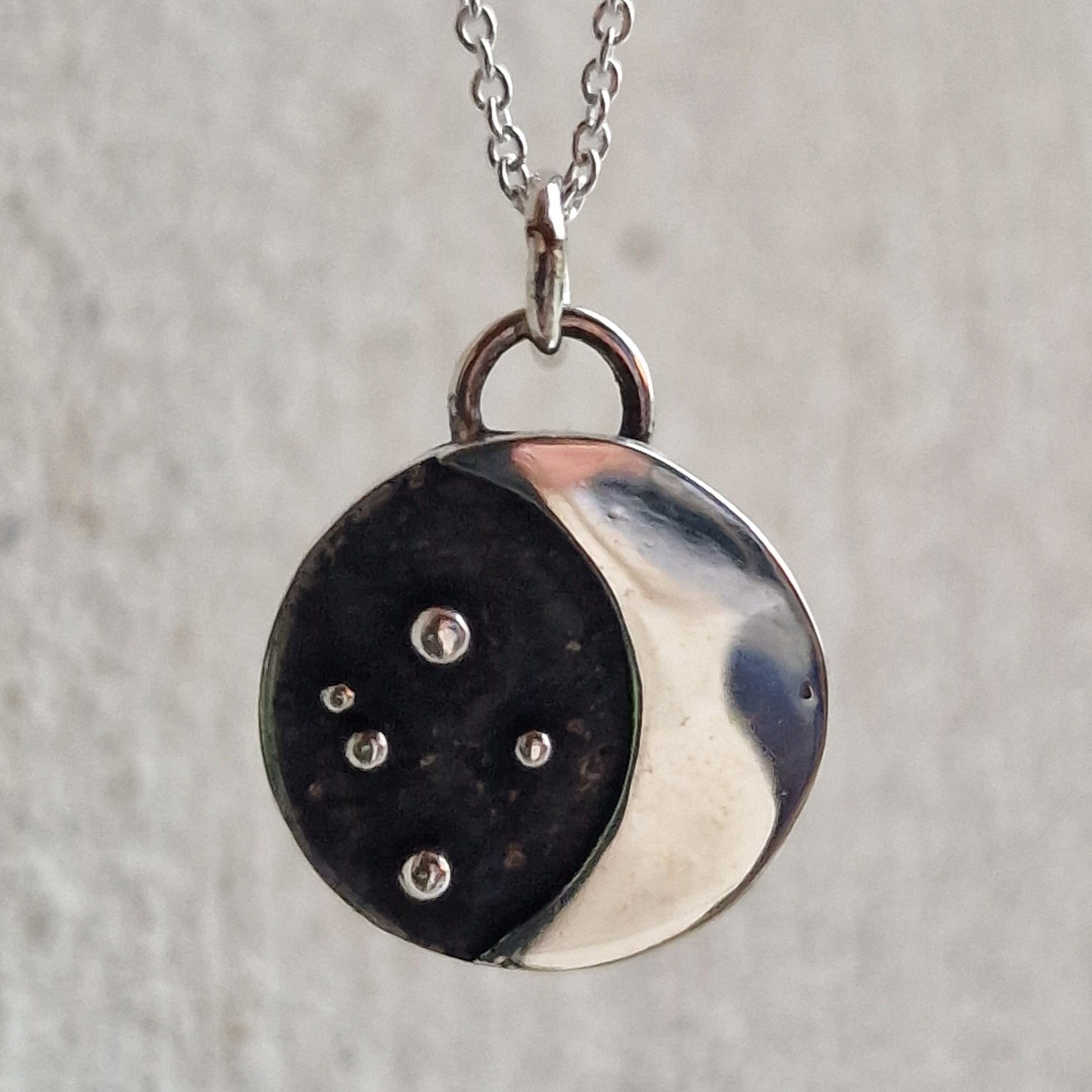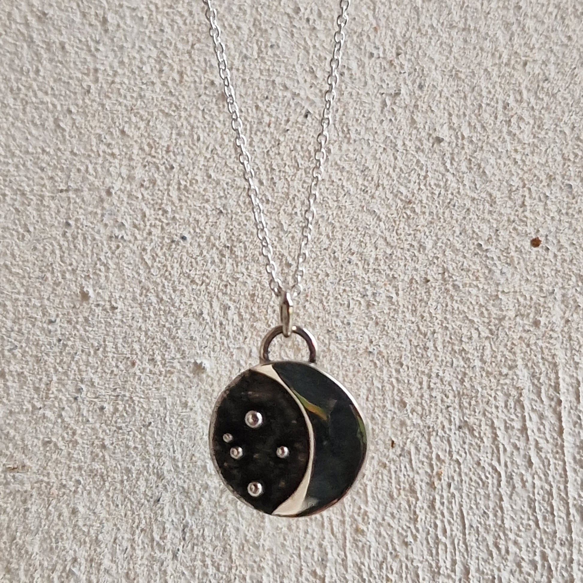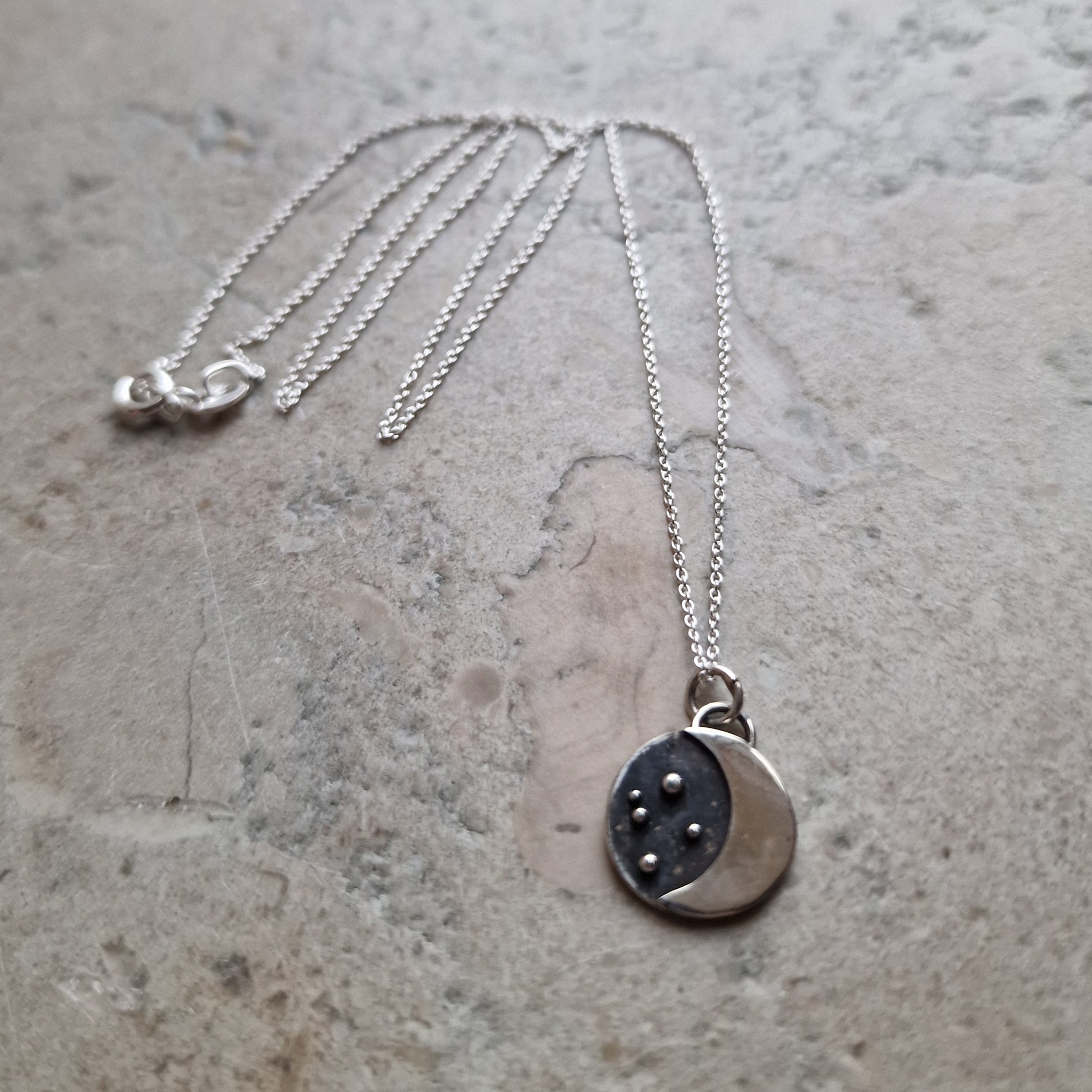Handgjort hänge av silver med en oxiderad natthimmel med stjärnor och en måne.