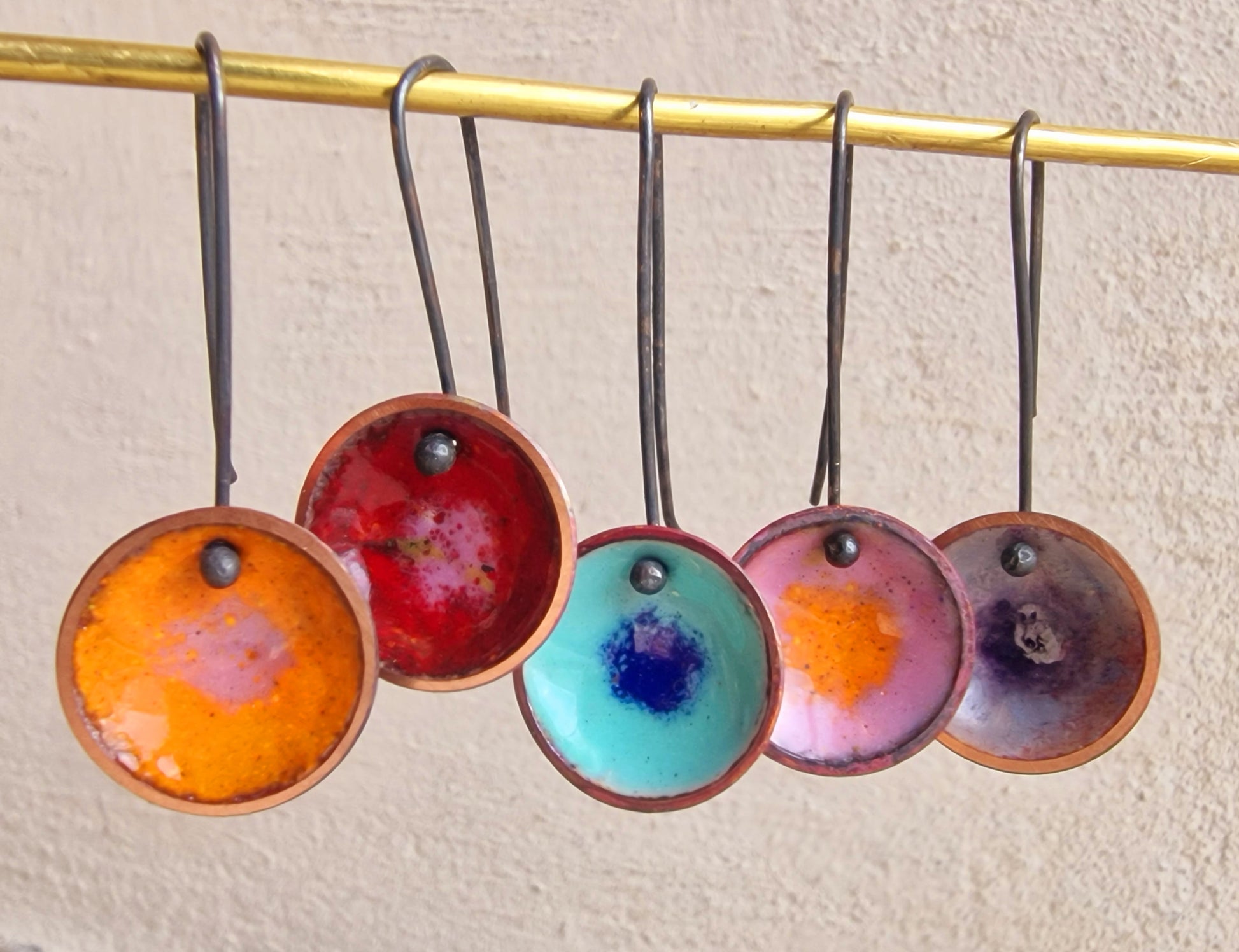 Örhängen av emalj på koppar och med öronkrok av oxiderat silver. Ange önskad emaljfärg vid beställning, färgen avser den yttre ringen på örhänget.