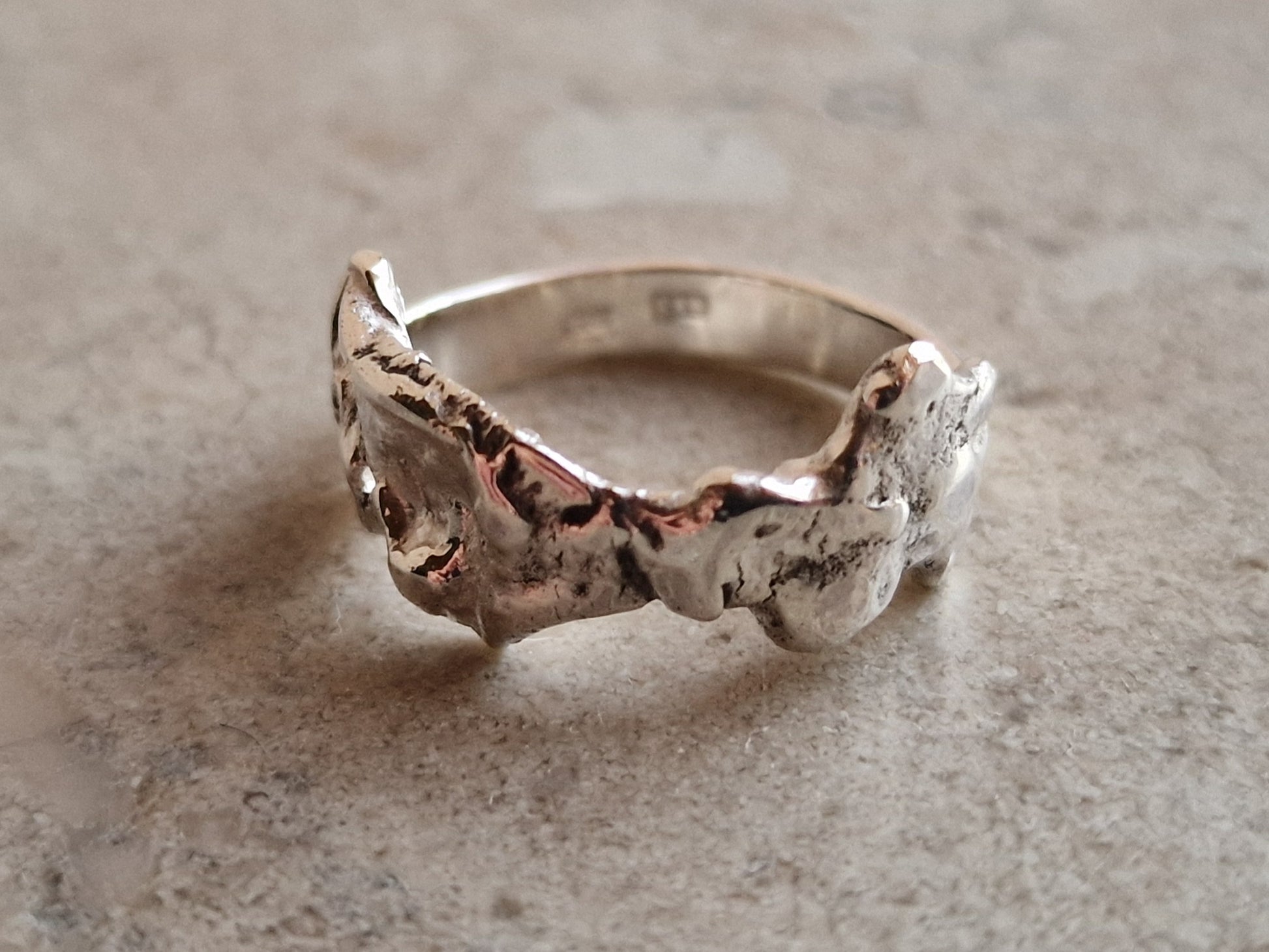 Handgjord silverring med rå, organisk form. Den texturerade ytan ger ett unikt uttryck där ingen ring är den andra lik. Unisex - passar alla. Justerbar storlek.